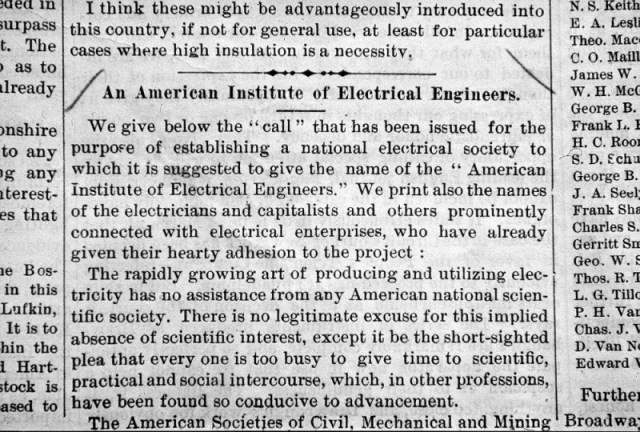 Today in 1884, the American Institute of Electrical Engineers (AIEE) was established in New York. The small group of men participating in the first meeting, a cross section of the electrical experts of the era, were responding to Nathaniel S. Keith’s call to organize a society of electrical professionals to represent the United States to foreign dignitaries who would be attending the International Electrical Exposition the Franklin Institute was hosting in Philadelphia that fall. The first AIEE president, Norvin Green, was the president of Western Union; the six vice presidents included Thomas Edison, telephone inventor Alexander Graham Bell, MIT physics professor Charles Cross, two veteran telegraphers, and an employee of equipment manufacturer Western Electric.