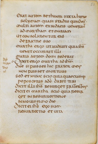 A page from the St Cuthbert Gospel relating part of the story of Lazarus, with a contemporary marginal note reading "de mortuorum", marking out a page to be read at masses for the dead (London, British Library, MS Additional 89000, f. 51r).