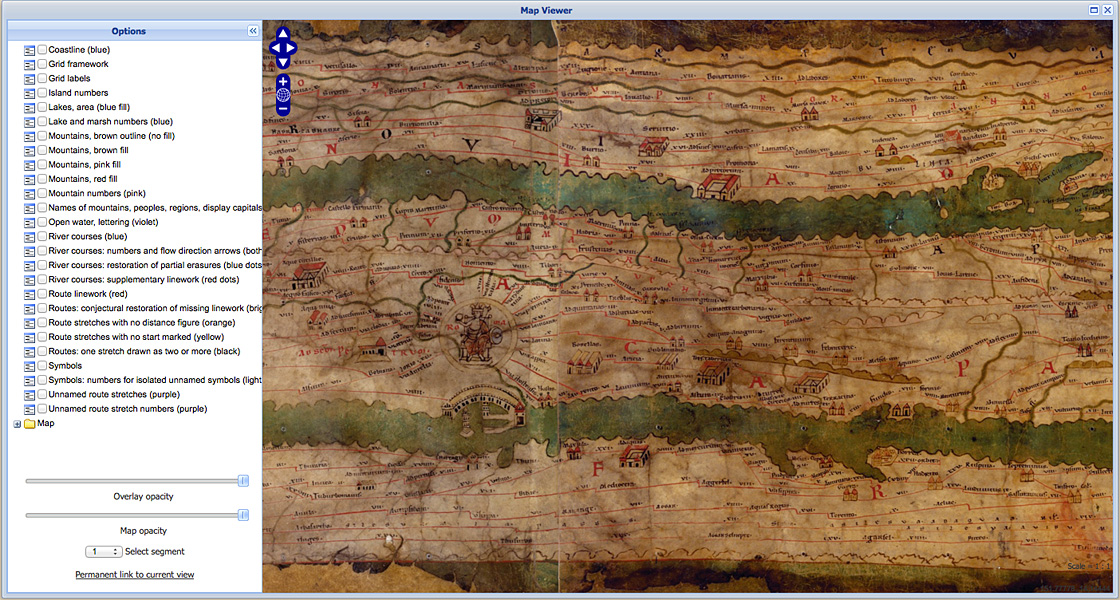 - Peutinger Map Viewer (see illustration), with an accompanying User’s Guide (pdf).
